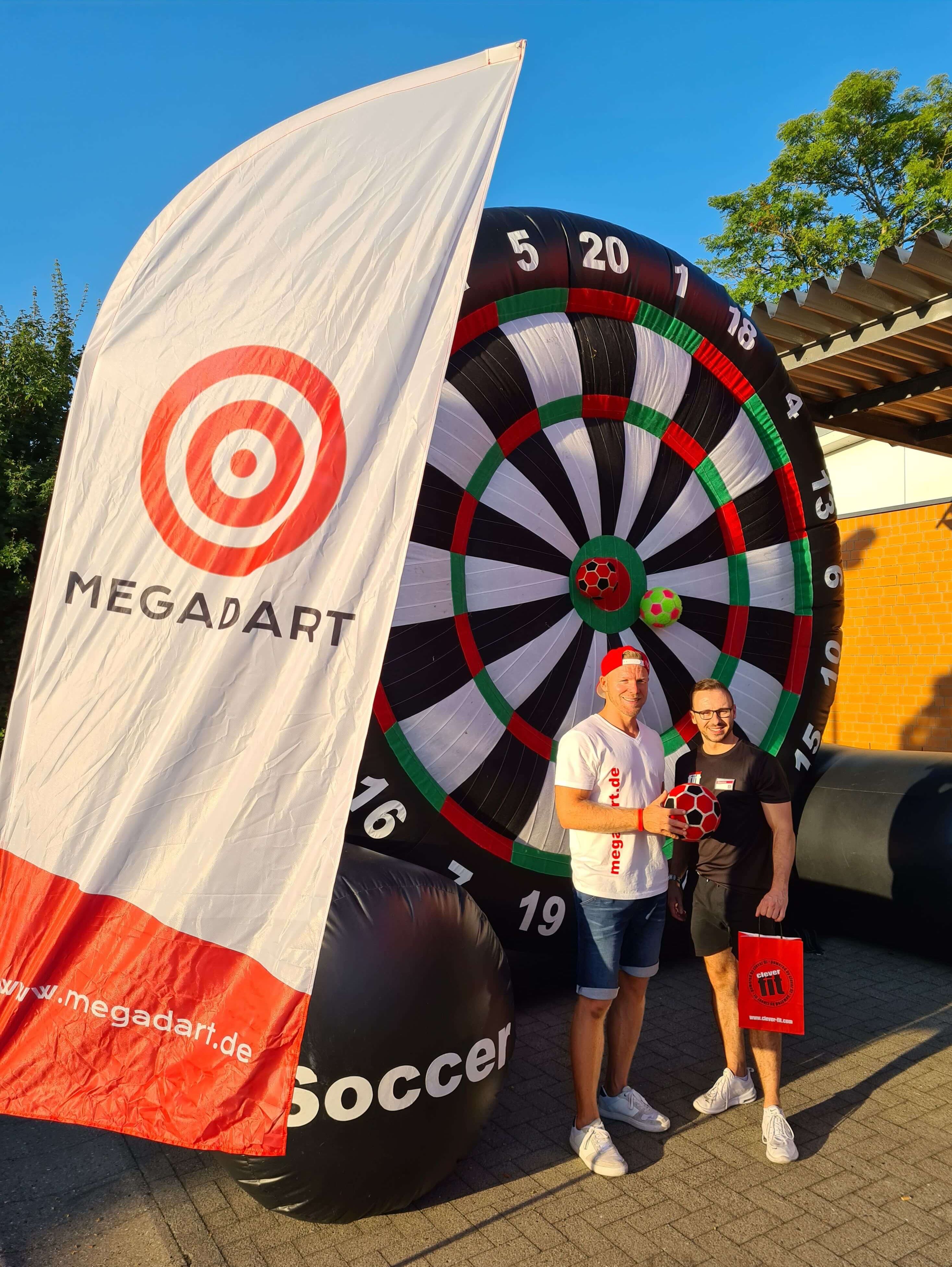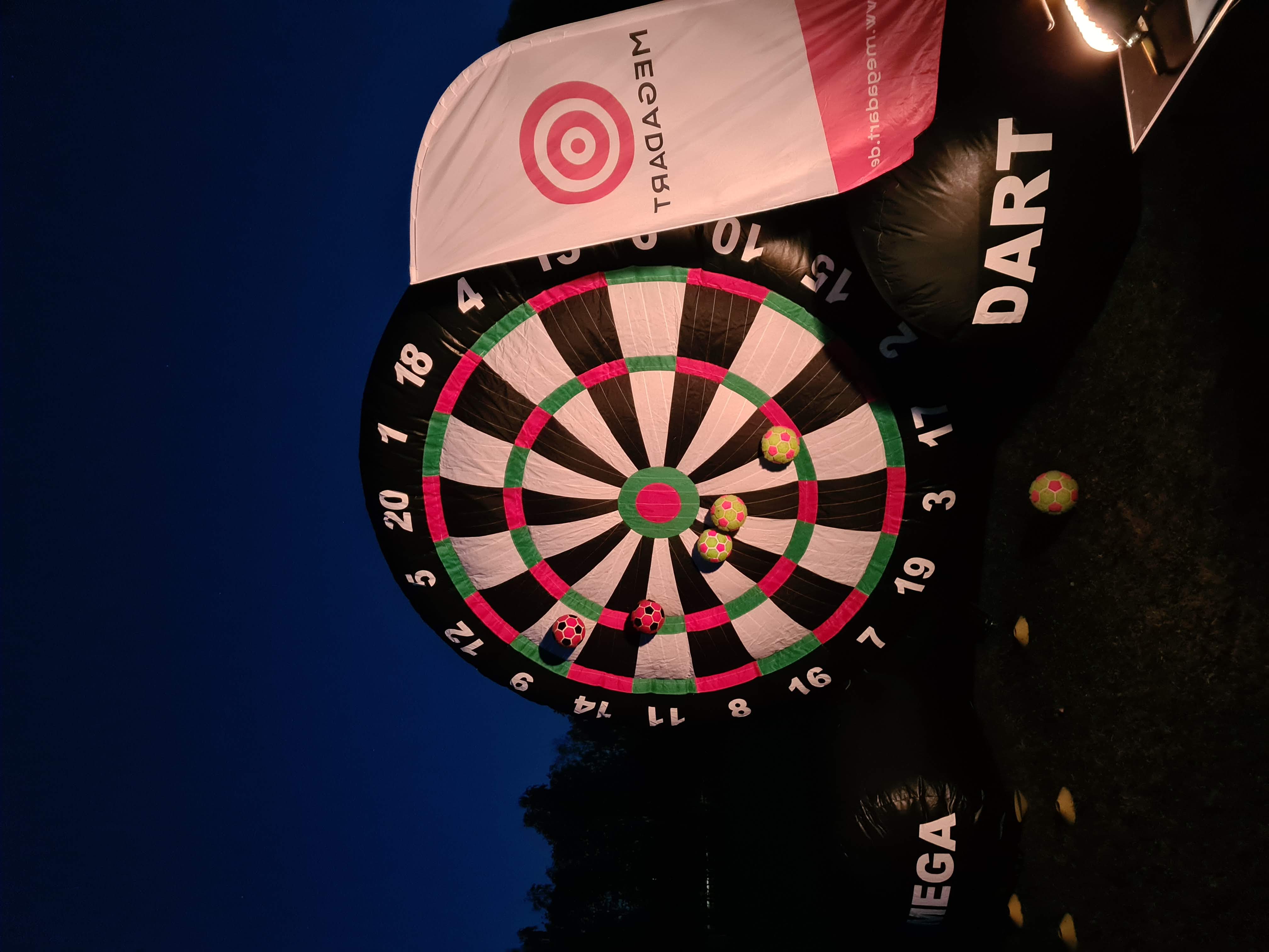 MEGA.DART (Fußballdart) wird auf einer aufblasbaren, überdimensionalen Dartscheibe von 4 x 5 Meter gespielt. Statt mit Dartpfeilen wird mit Klett-Fußbällen gepunktet, die leichter als ihre herkömmlichen Originale sind. Somit richtet sich MEGA.DART sowohl an Anfänger als auch Elfmeterkönige – ganz gleich, ob Frau oder Mann, Groß oder Klein.