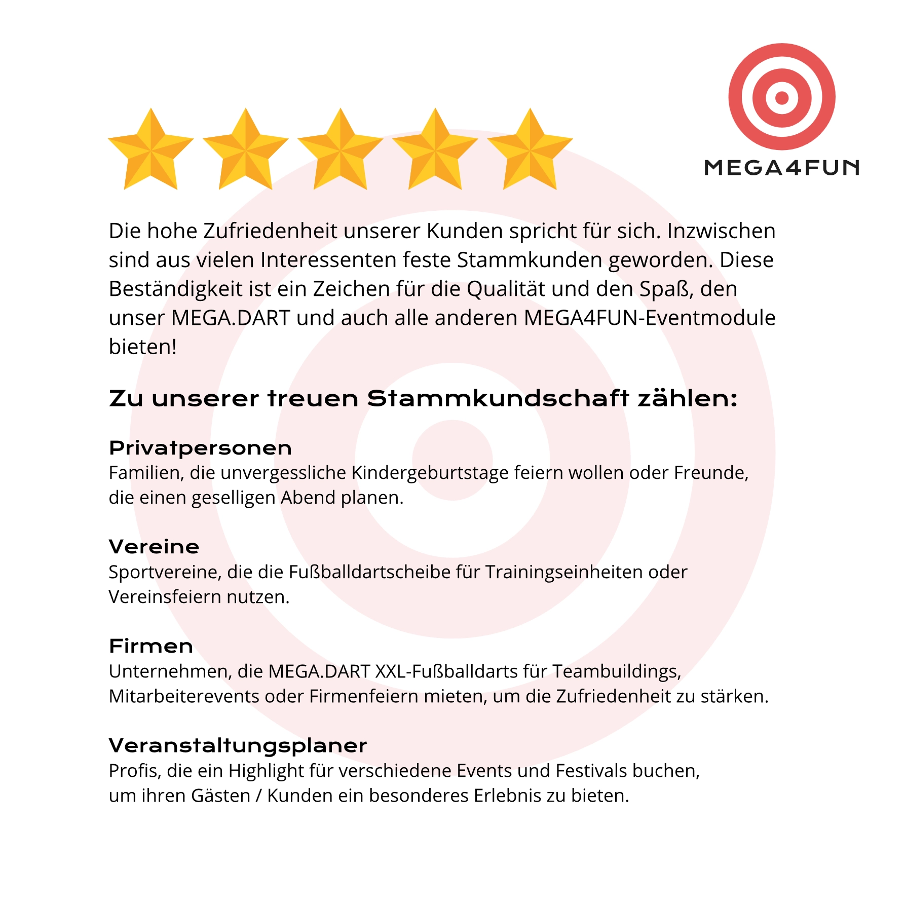 Die hohe Zufriedenheit unserer Kunden spricht für sich: inzwischen sind aus vielen, anfänglichen Interessenten Stammkunden geworden. Diese Beständigkeit ist ein Zeichen für die Qualität und den Spaß, den unser Fußballdarts sowie alle anderen unserer Eventmodule bieten.