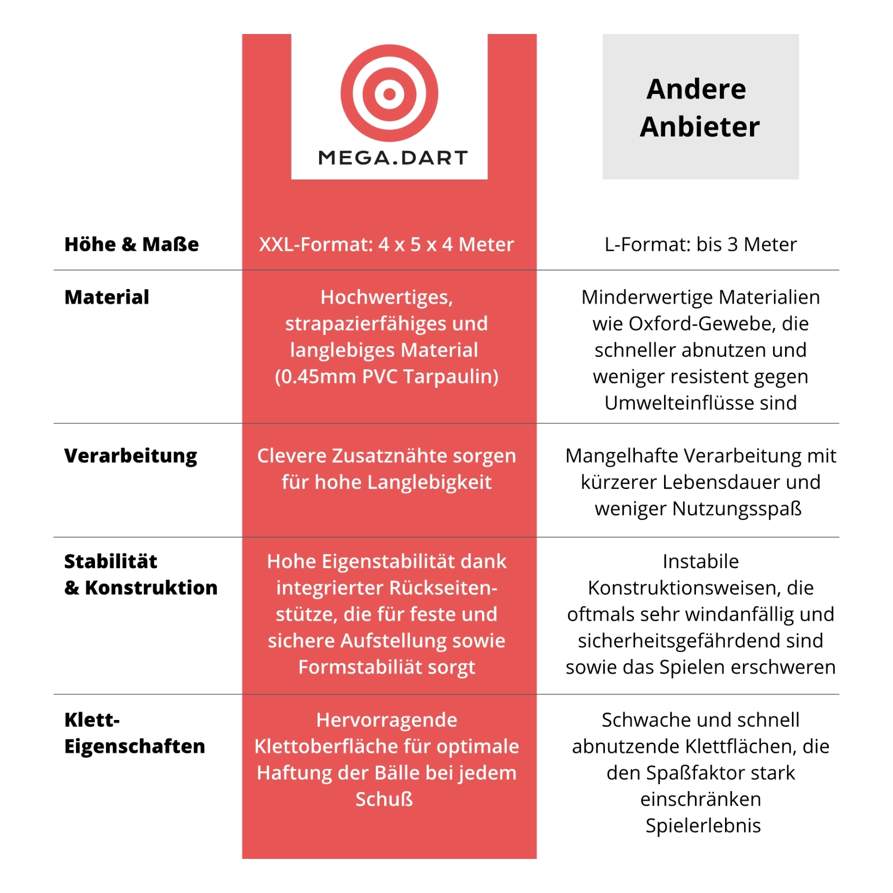 Die Klettoberfläche/-Eigenschaften von MEGA.DART Fußballdarts sind speziell entwickelt, um eine optimale Haftung der Bälle bei jedem Schuss zu gewährleisten. Günstige Modelle haben oft schwächere Klettflächen, die nicht richtig haften oder sich schnell abnutzen. Der Spaßfaktor leidet erheblich darunter, der Zweck des Mietens verfehlt.