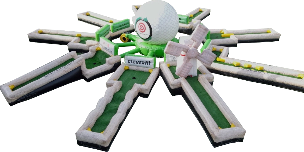 Eine mobile, aufblasbare 9-Loch-Minigolfanlage zum Mieten – perfekt für Events, Messen, Firmenfeiern und Freizeitveranstaltungen. Die innovative Minigolfbahn sorgt für flexiblen Spielspaß, zieht Besucher an und begeistert Gäste aller Altersgruppen.